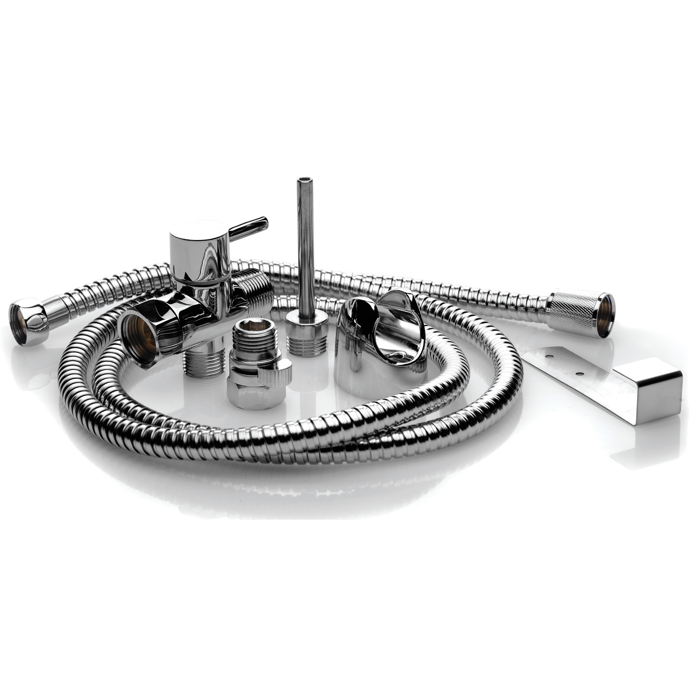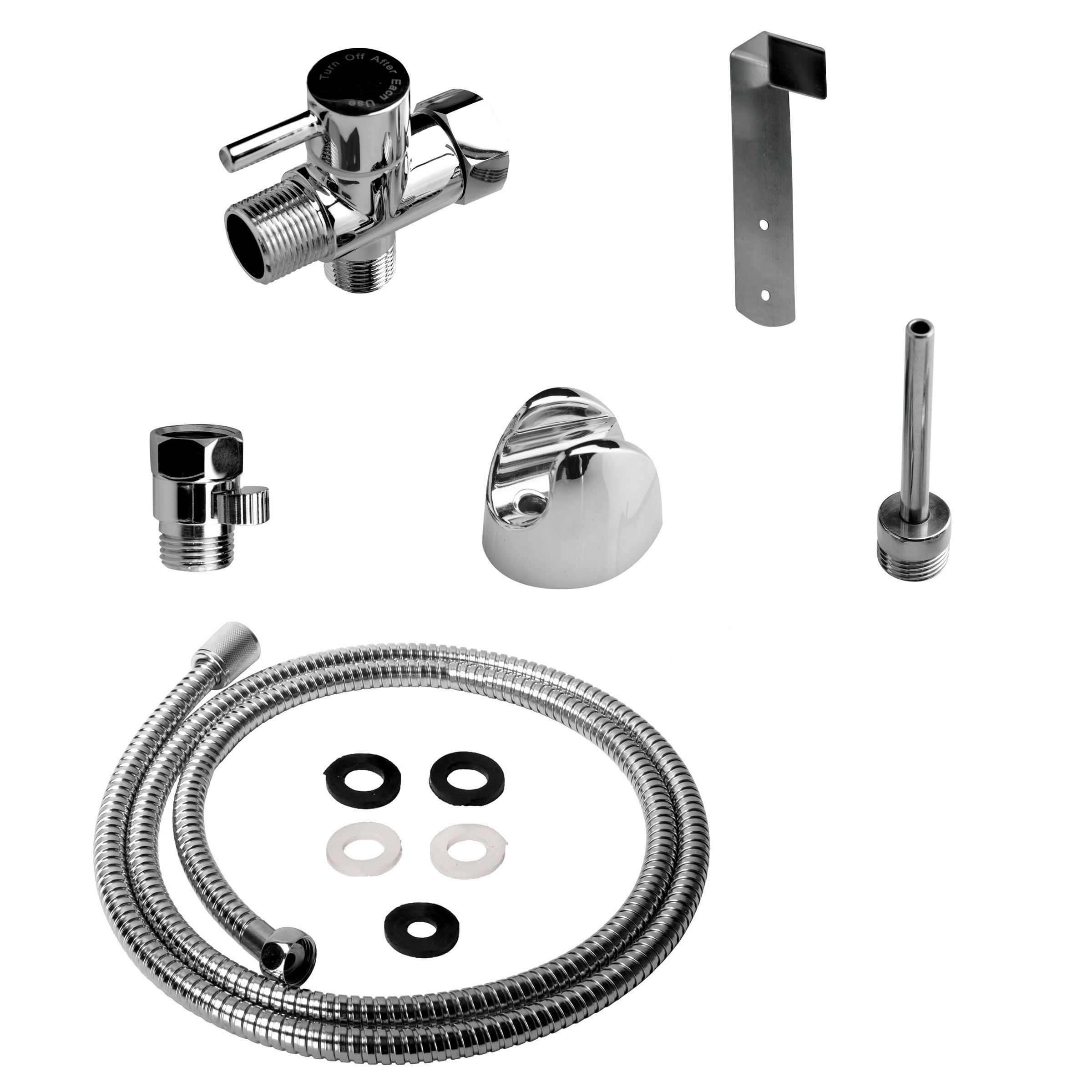 Note: Includes dual control valve, hose, water flow valve, nozzle, hanging hook, attachment holder, 2 screws, 2 screw fasteners, and 2 caps.