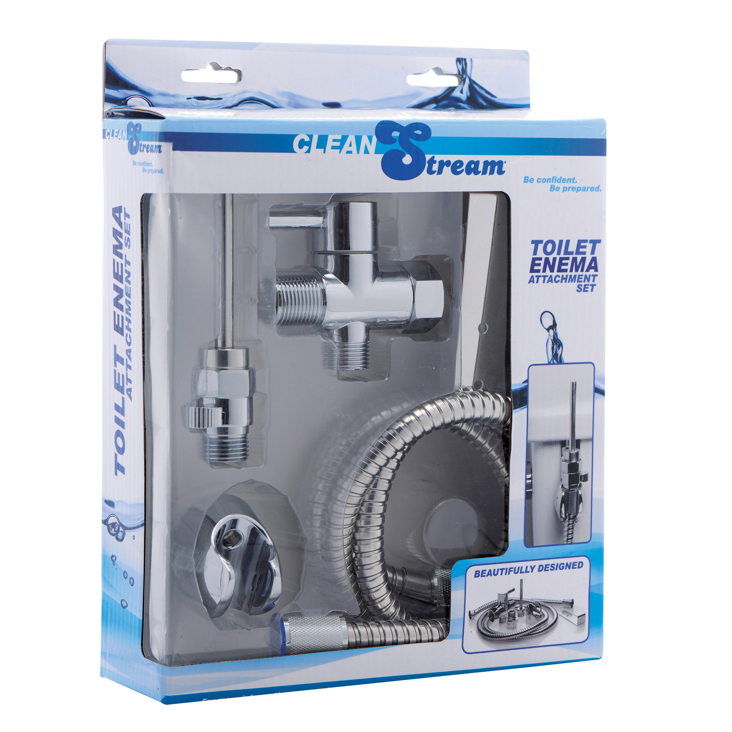 Whether it is for health, pleasure, or preparation for anal sex, the Clean Stream Toilet Enema Attachment Set is the most convenient, effective, and comfortable way to clean out! The same power and efficiency that you appreciate and enjoy from a shower enema attachment can now be obtained without the hassle of getting in and out of the shower. This set has everything you need to instantly transform your commode into a high-powered anal douche. Just attach the dual control valve onto the water pressure valve at the base of your toilet. You will be able to control the amount of water that flows up into the steel hose. Connect the water control valve and the nozzle to the other side of the hose. The slider will allow you to control the flow of water as it enters your anus. The smooth stainless steel nozzle inserts easily, particularly with a bit of silicone lube, and sterilizes with soap and water. The hanging hook and attachment holder allow you to keep the nozzle stored in an opportune location on the side of the tank.